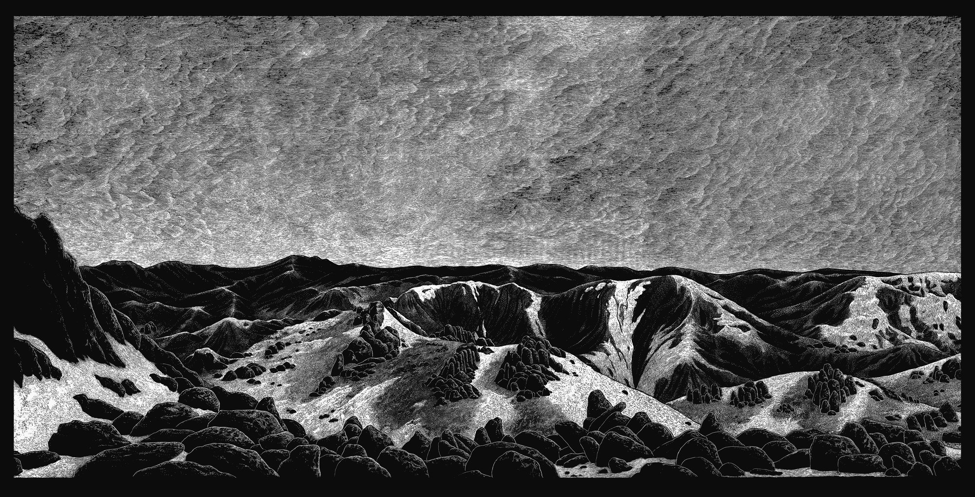 Handprinted 1-color silkscreen (white) on black cardboard (250 g/m²), size 51 x 100 cm.